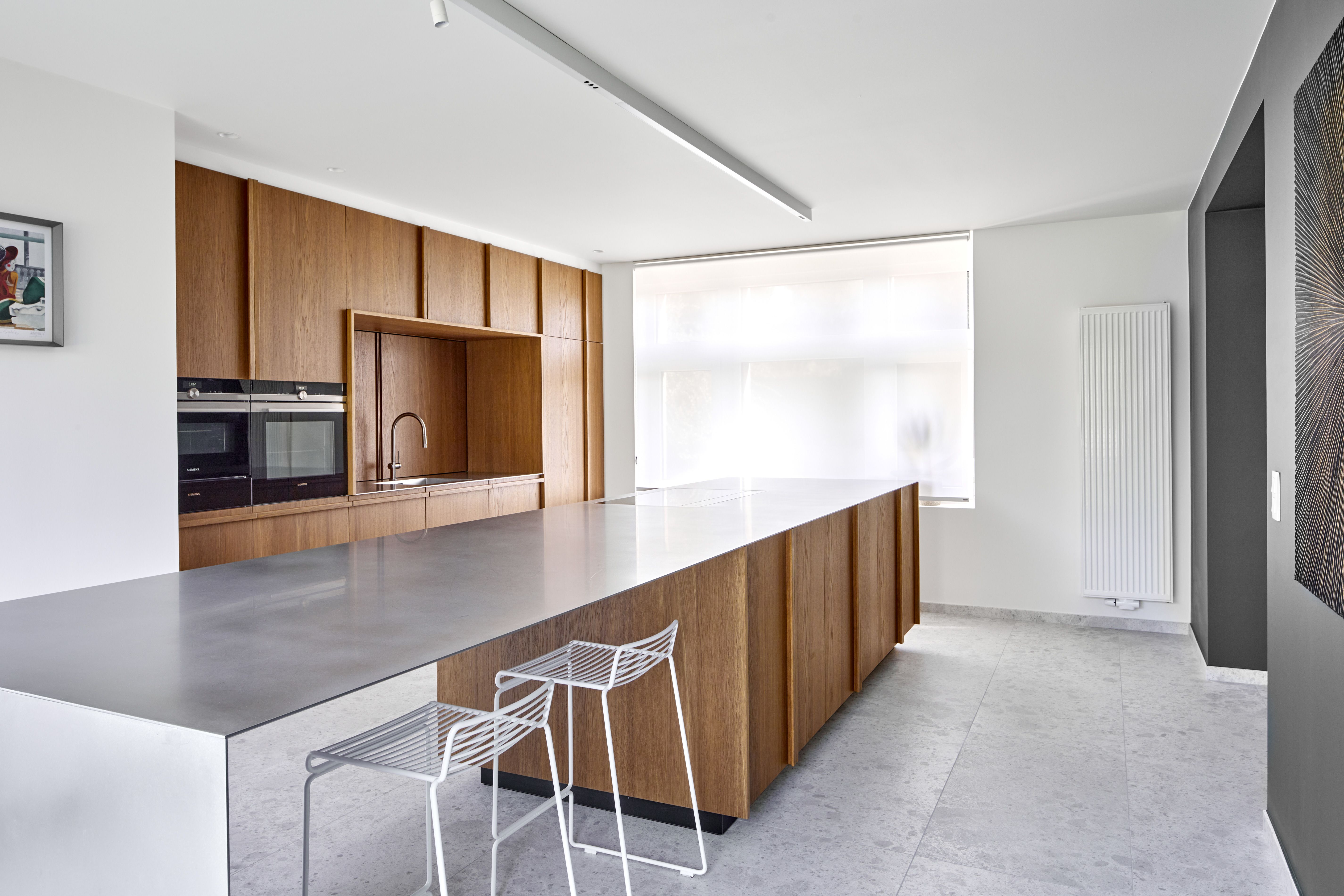Projet mis en valeur par son côté rétro en alliant un plan de travail inox et du chêne teinté.